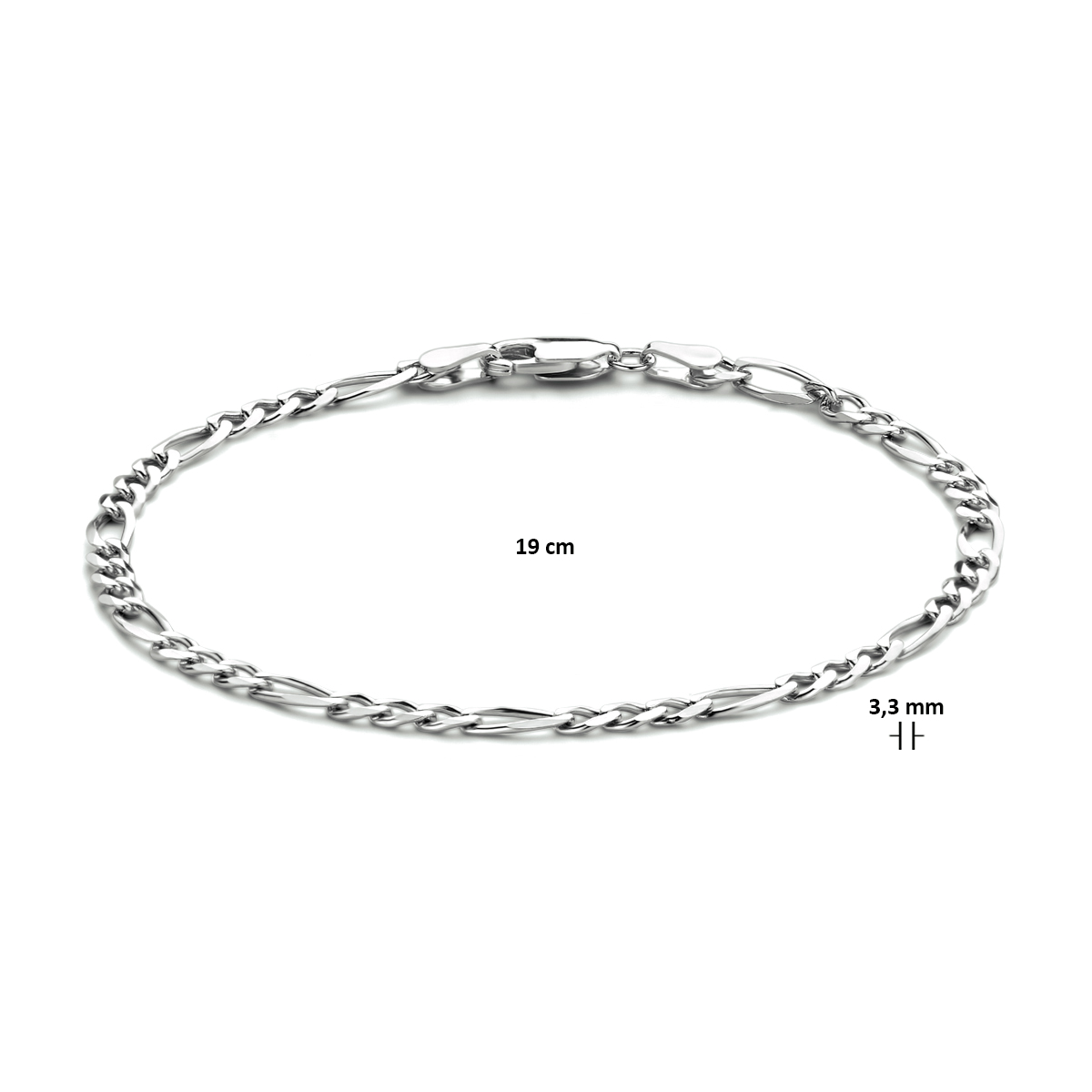 Gerhodineerd 925 zilveren armband uitgevoerd met een figaro schakel en een breedte van 3.3mm. De armband heeft een draaglengte van 19cm en een stevige karabijn sluiting.