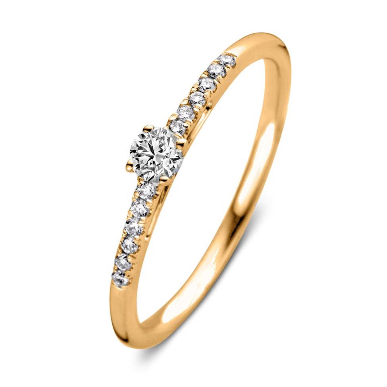 Ring Mary is een absoluut plaatje om te zien. Deze moderne klassieker bevat een prachtige briljant in vierpootszetting omgeven door fijnere briljanten in de scheen. Dankzij de open zetting vangt de diamant veel licht en schittert hij optimaal. Mary is prachtig te combineren met  een gladde of diamanten rijring. Probeer haar voor extra sparkle bijvoorbeeld eens samen met ring Millie.