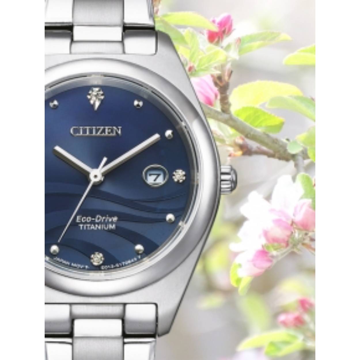Citizen EW2600-83L dameshorloge. Een elegant horloge met een titanium kast en band en een donkerblauwe wijzerplaat met subtiel golvend patroon.