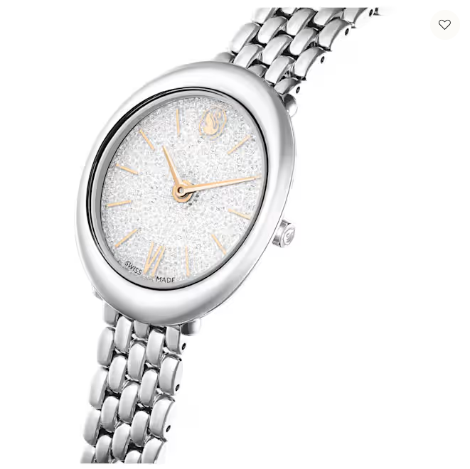 Het Imber-horloge brengt een moderne kijk op horlogemaken over door de glinsterende wijzerplaat en tijdloze elliptische vorm. Deze 24 x 26,3 mm-versie is vervaardigd uit edelstaal en heeft ongeveer 1000 heldere kristallen op de Crystalline-wijzerplaat. Extra details zijn afgewerkt met een goudkleurige toplaag, waaronder de uurmarkeringen en wijzers, evenals het enkele Romeinse cijfer op 6 uur en het iconische zwanenlogo van Swarovski op 12 uur. Het Swiss Made-horloge wordt gedragen aan een gepolijste metalen armband en biedt een waterbestendigheid tot op 50 m. Maak dit uw favoriete keuze voor een verfijnde stijl, zowel overdag als ‘s avonds.