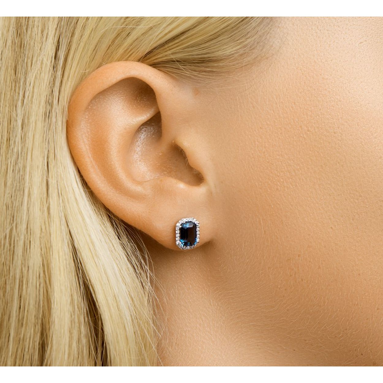 14k Witgouden oorknoppen uitgevoerd met een prachtige London blue topaas en een diamanten rij. De afmeting van de oorknoppen is 9.5x7mm. De steenmaat is 7x5mm.
