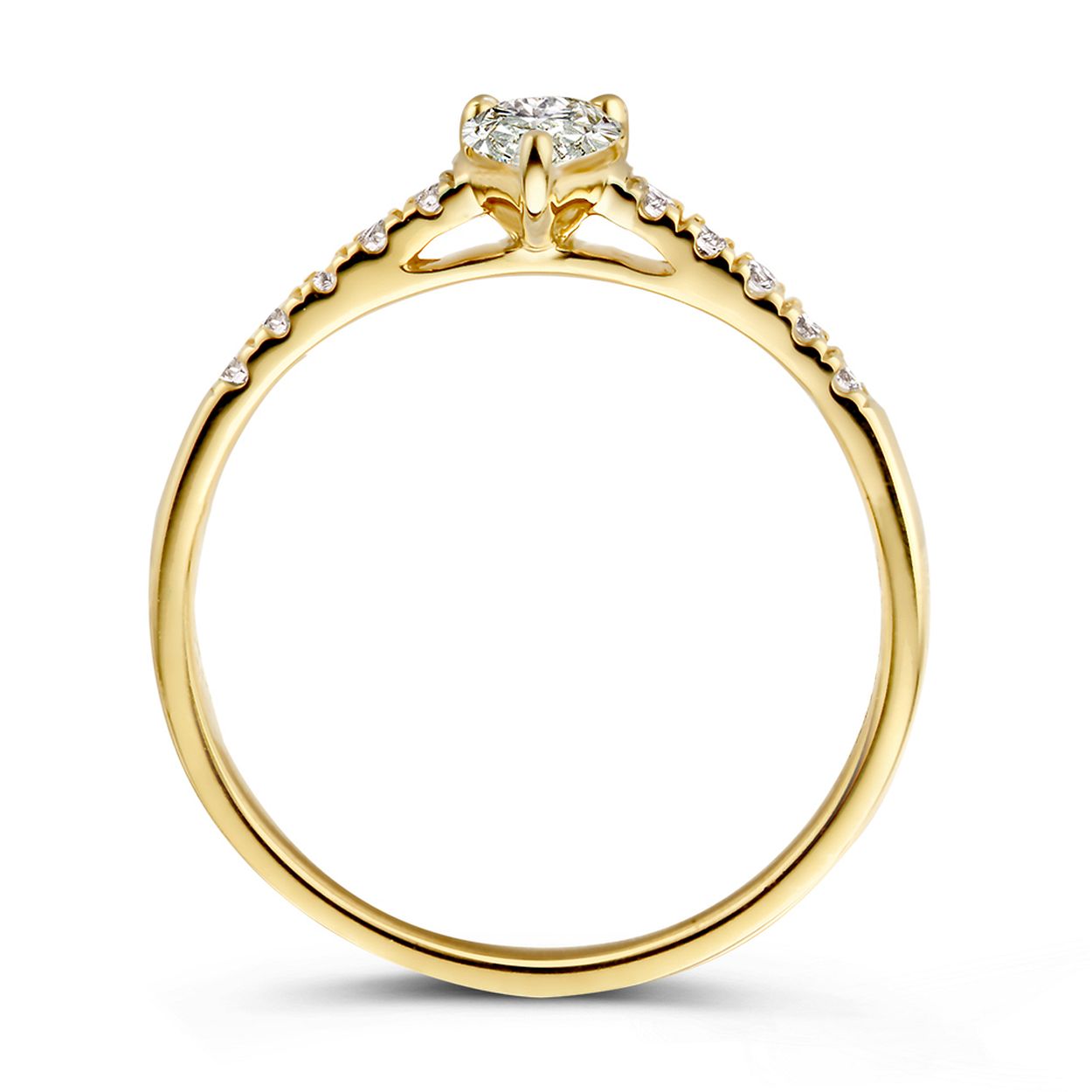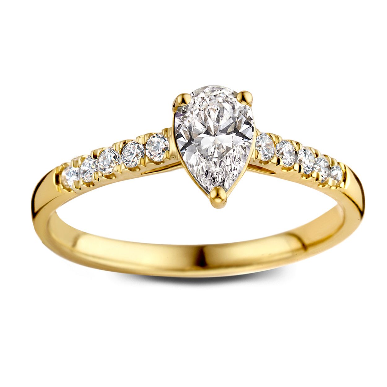 Geelgouden ring 'Ava Royal' met peer middensteen (0,30 crt.) en zijstenen gemaakt van 18 karaat gerecycled goud.