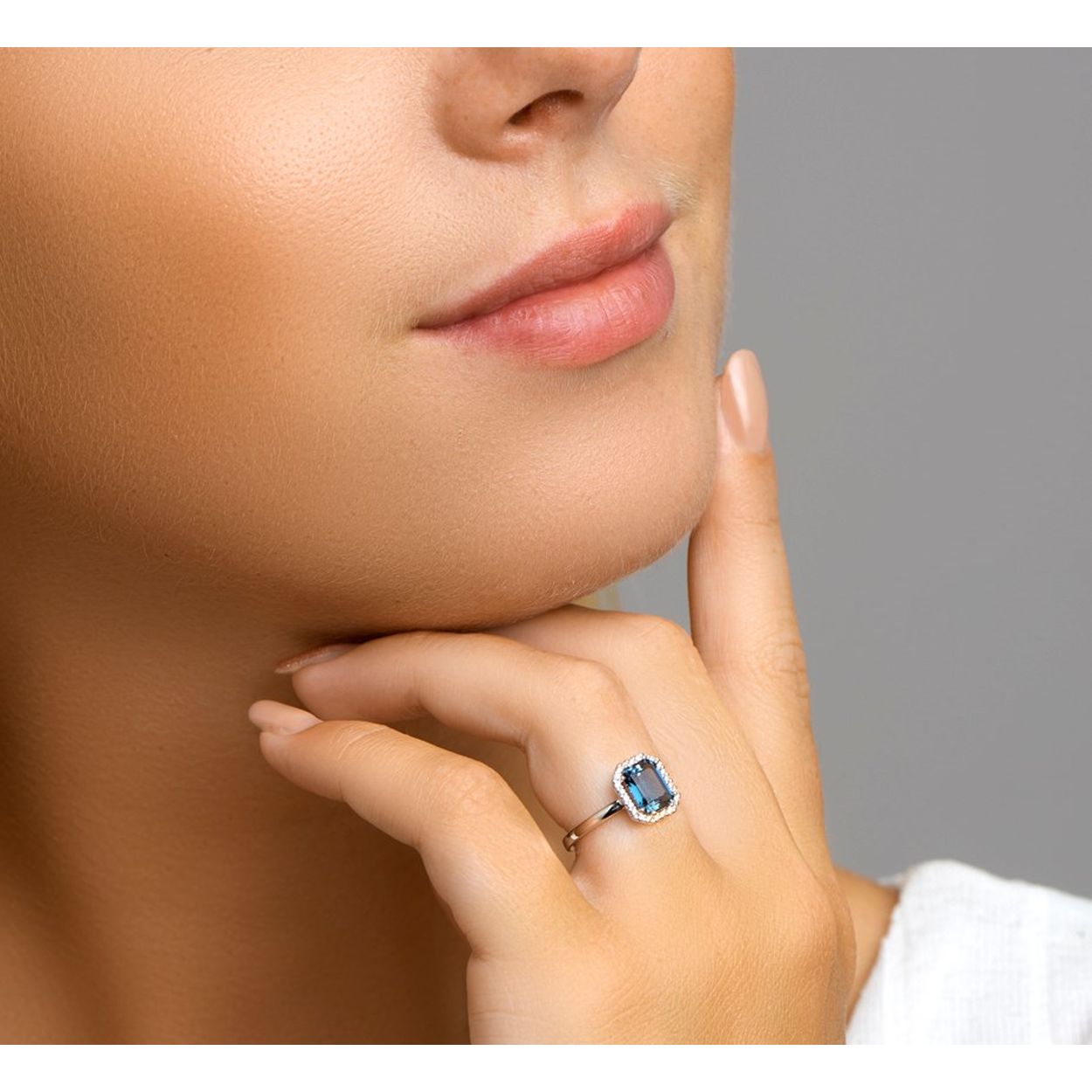 14k Witgouden ring met schitterende London blue topaas en een diamant rij. De ring heeft een breedte van 9mm en een steenmaat van 8x6mm.