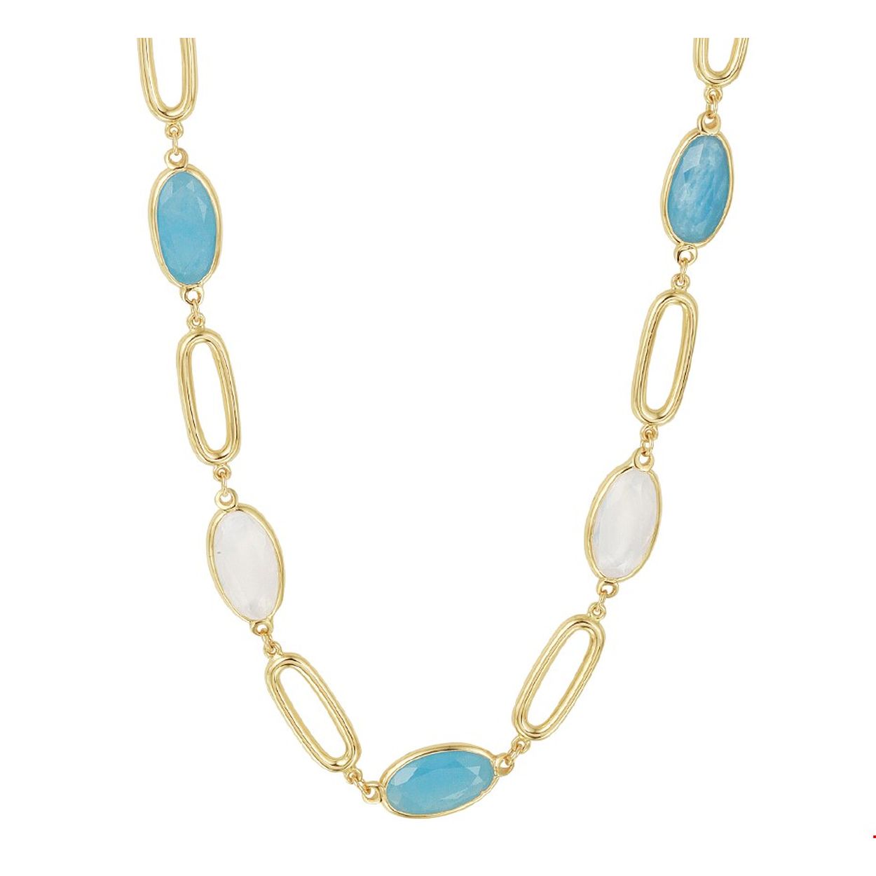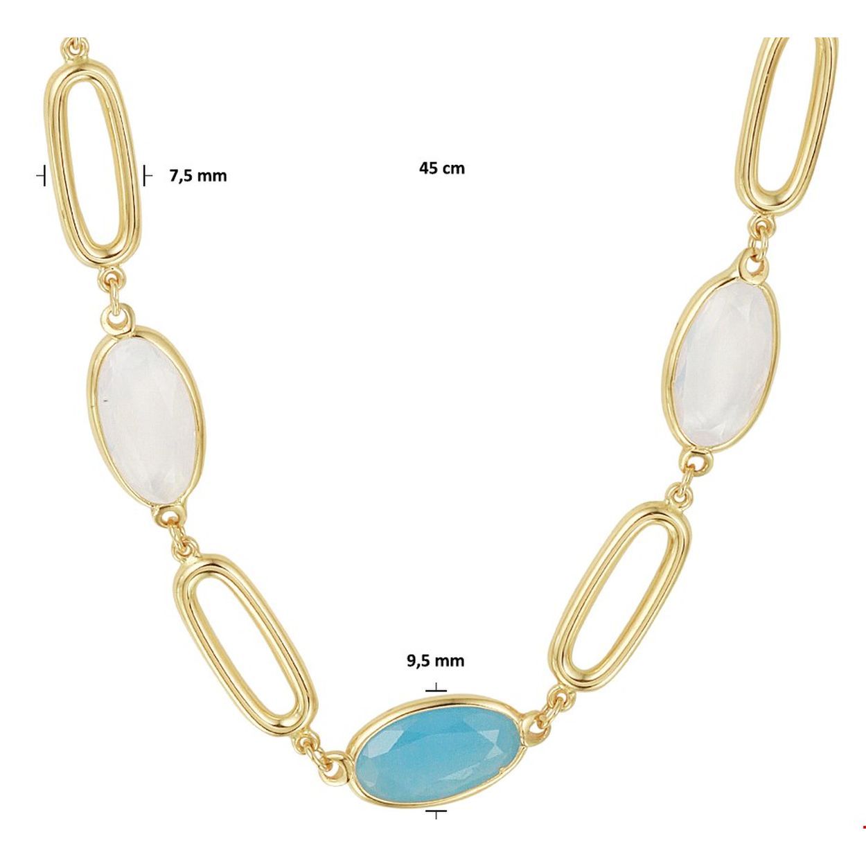 Beschrijving: Stijlvol geelgouden collier met een draaglengte van 45cm. Uitgevoerd met schitterende aquamarijn en wit kwarts. De uniek geslepen stenen en poli afgewerkte open elementen maken dit sieraad tot een ware eyecatcher! Het collier heeft een karabijn sluiting en is te combineren met bijpassende sieraden uit onze collectie.