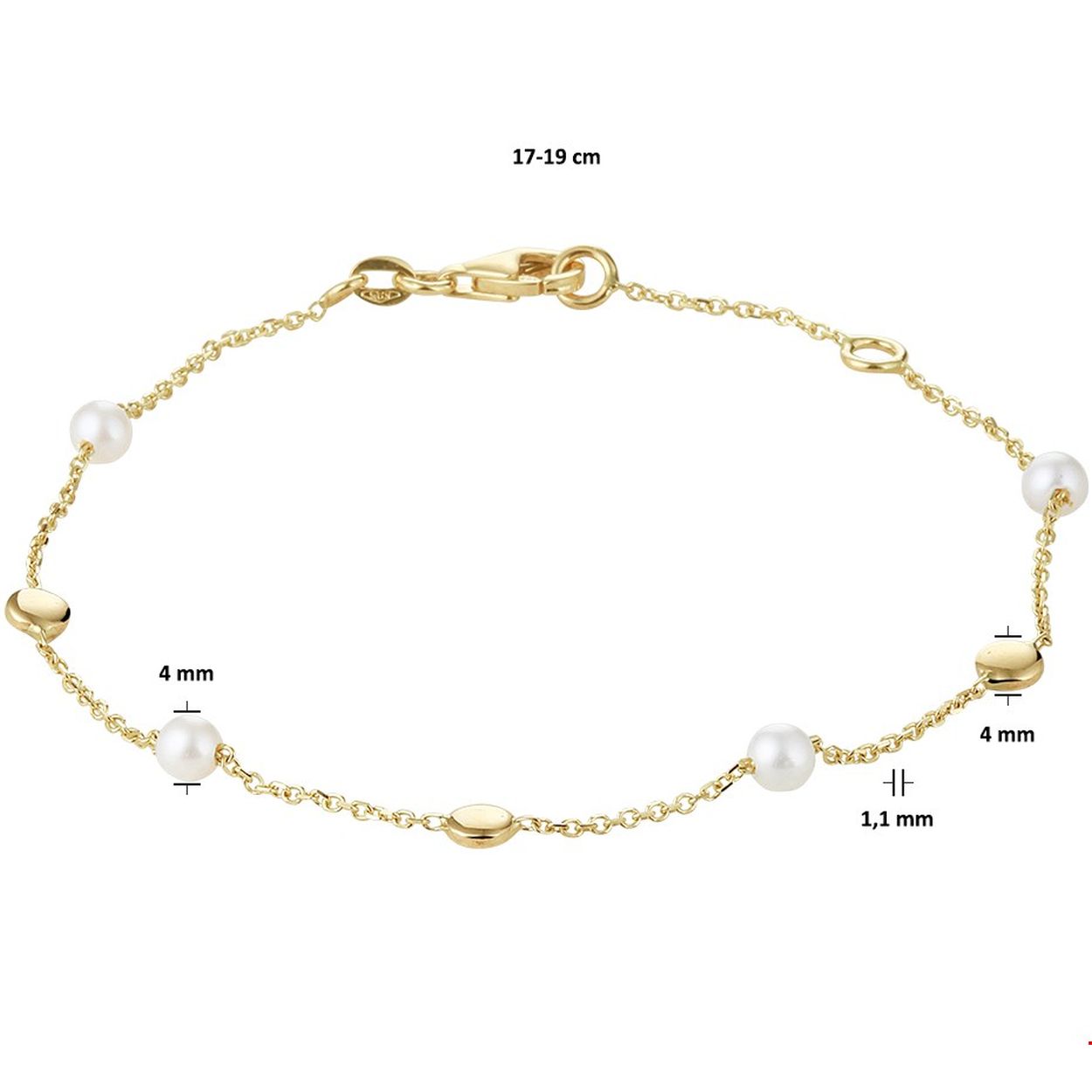Beschrijving: Stijlvolle geelgouden anker armband uitgevoerd met poli afgewerkte rondjes, zoetwaterparels en een stevige karabijn sluiting. De armband heeft draaglengtes van 17 en 19cm en is goed te combineren met bijpassende parel sieraden uit onze collectie of vanuit je eigen stash!