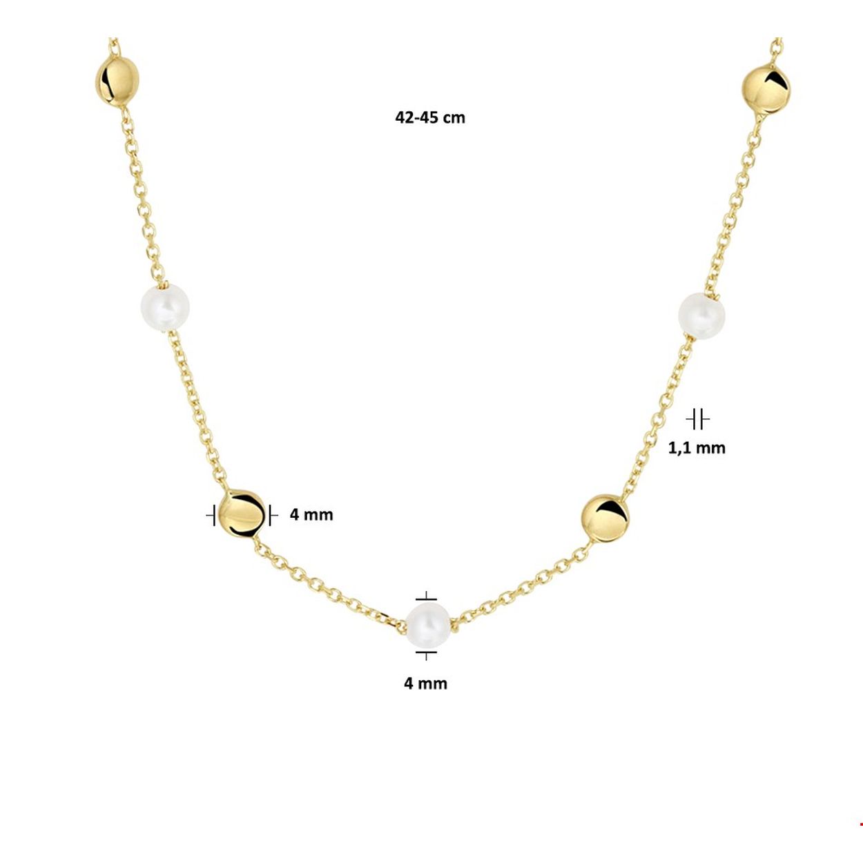 Beschrijving: Stijlvol geelgouden anker collier uitgevoerd met poli afgewerkte rondjes, zoetwaterparels en een stevige karabijn sluiting. Het collier heeft draaglengtes van 42 en 45cm en is goed te combineren met bijpassende parel sieraden uit onze collectie of vanuit je eigen stash!