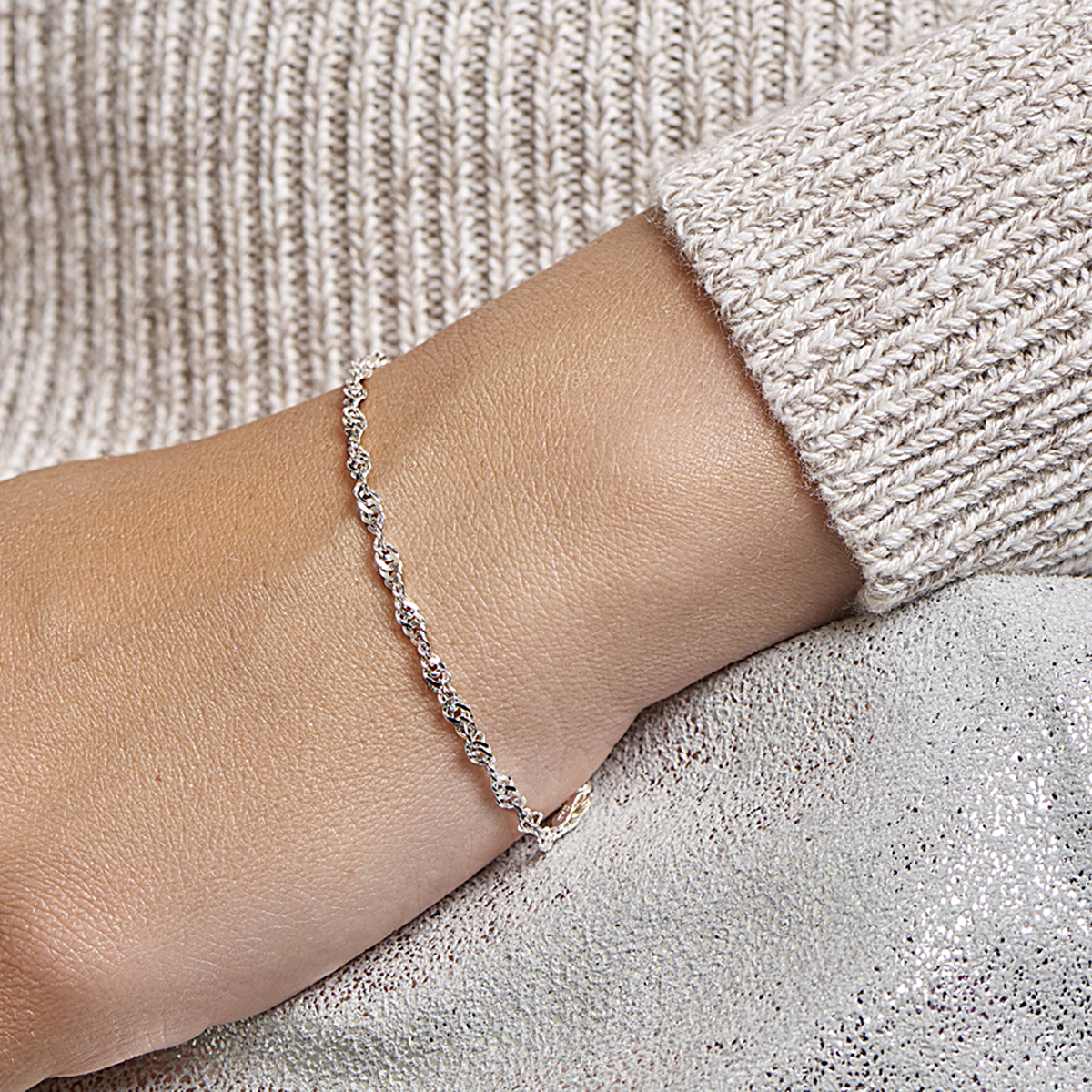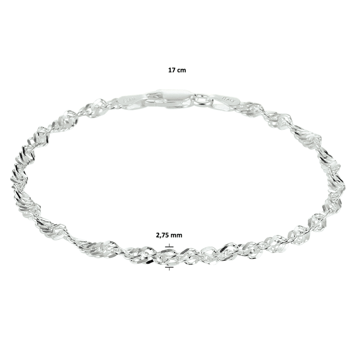 Deze zilveren singapore lengte artikel heeft een schakelbreedte van 2.75mm. Uitgevoerd met een stevige karabijn sluiting.