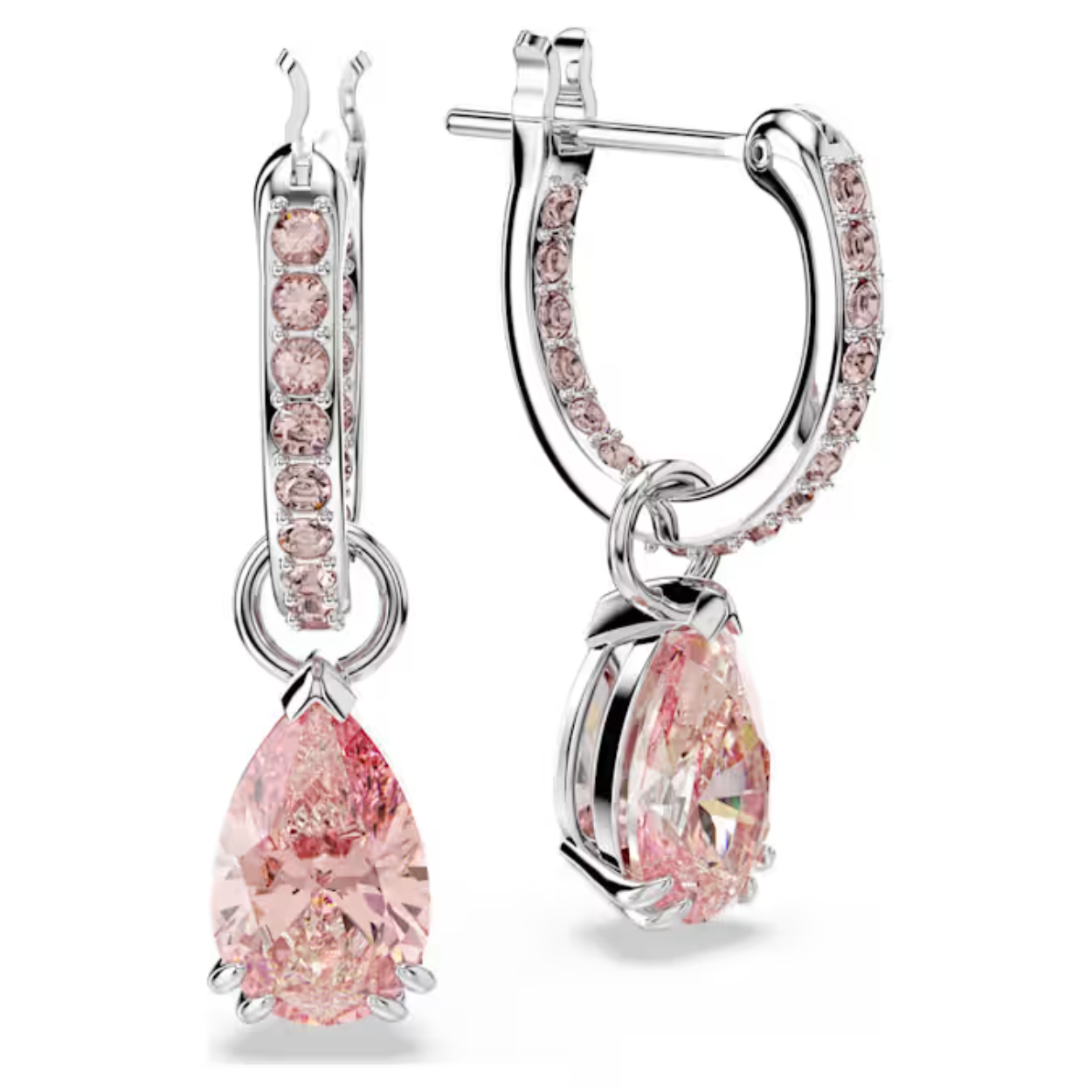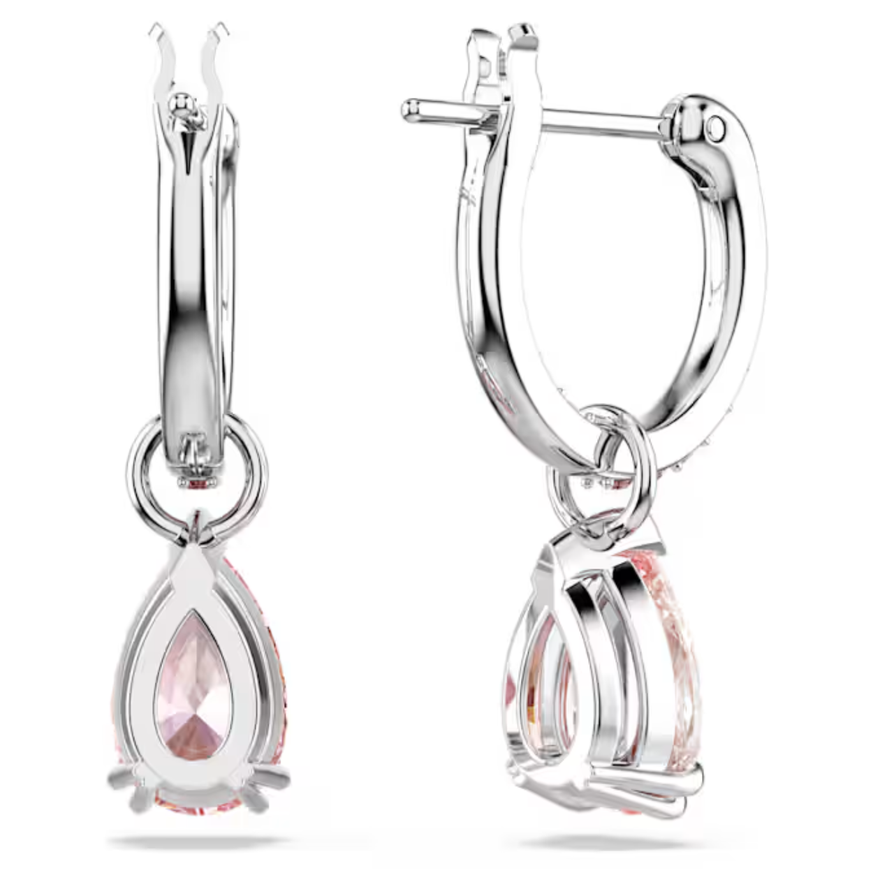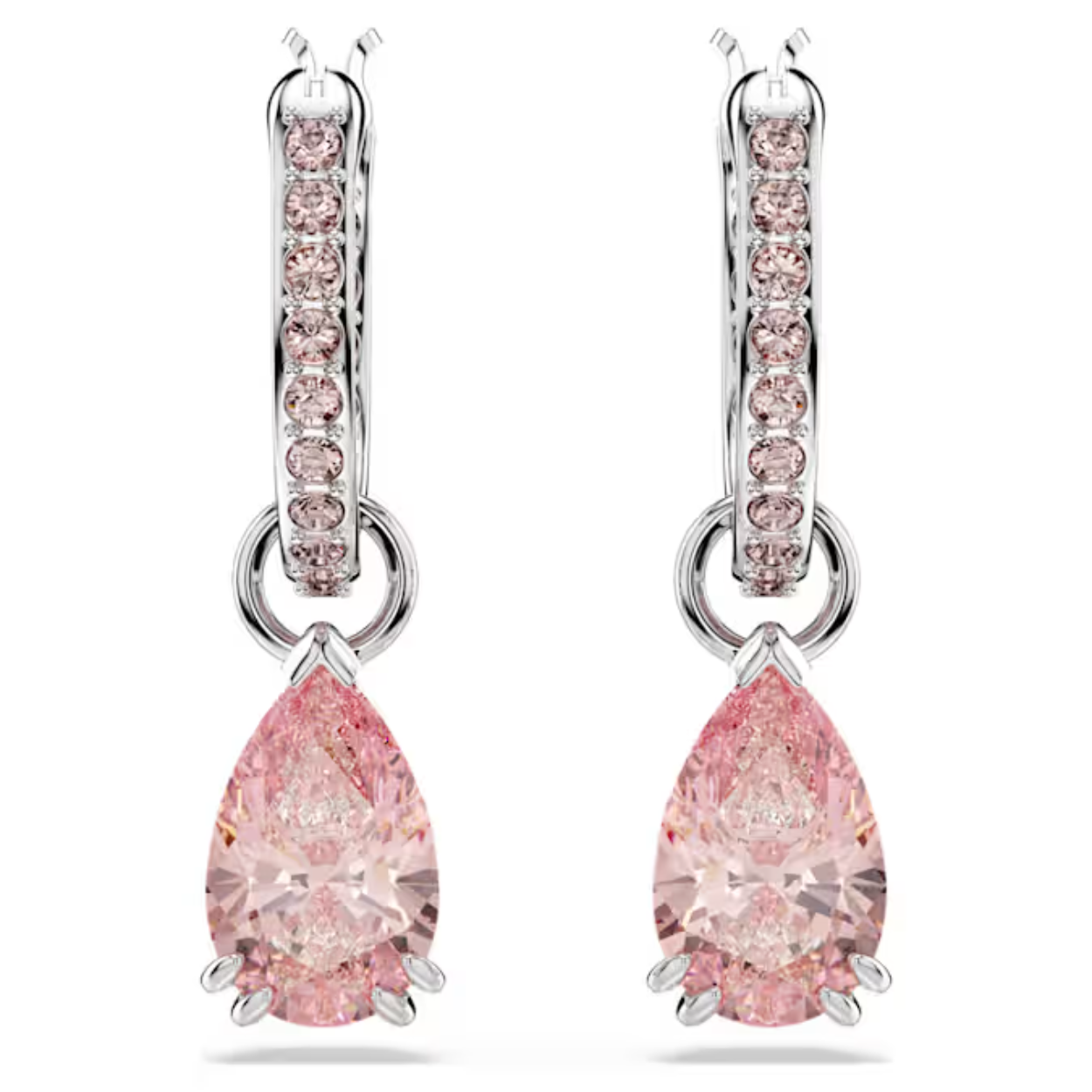 Deze oorbellen vangen het licht vanuit elke hoek en worden geheid uw nieuwe stijlfavoriet. Een roze kristal in Pear-slijpvorm hangt aan ringen met een rhodium toplaag, die zijn bezet met oogverblindende roze pavé. Draag ze met opgestoken haar in combinatie met andere sieraden uit dezelfde lijn.