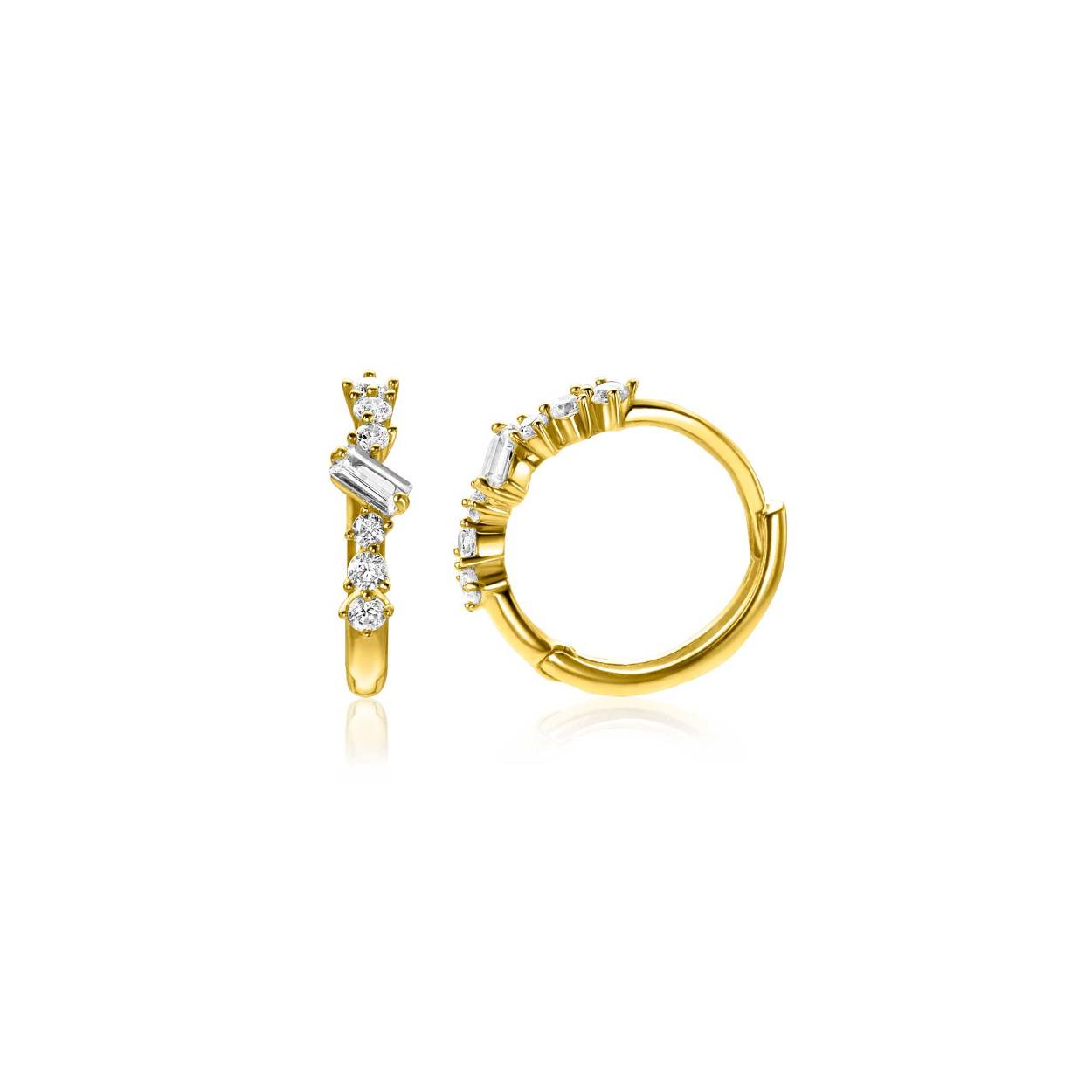 ZINZI Gold 14 karaat gouden oorringen met in het midden een rechthoekig banguette geslepen zirkonia en speels drie ronde witte zirkonia's boven en onder gezet. De ronde zirkonia's verschillen allemaal van grootte, wat een fantasie look geeft aan de oorrringen. Grootte 13mm en een 2mm brede buis. Met een luxe en gemakkelijk klapsluiting. Vervaardigd van geheel 14 karaat goud (585).
